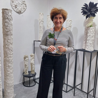 Les déclinaisons de bis, blancs-cassés, beiges seulement distraites par quelques perles dorées, signalent comme une nécessité d’essentiel. Les totems, les porte-bouquets en grès d’Agnès Delettre aimantent le regard, suscitent le désir d’effleurer pour rencontrer cette matière qui permet la fluidité des lignes, les anfractuosités des plissés. La féminité est partout ; le minutieux travail des formes phalliques des totems en grès brut n’en est que la subtile affirmation. Recouverts entièrement de corolles aux multiples pétales, ils sont des hymnes à la fécondité, des promesses de floraison. Les efflorescences en font des sculptures à l’infinie douceur. Les grès comme les faïences d’Agnès Delettre sont comme des prolongements, des auras. Le sourire et le regard comme l’extrême sensibilité suggérée par ses sculptures parlent d’elle et exposent l’artiste. Sa carte de visite soft touch est à l’unisson d’une expérience visuelle conjuguée à la sensualité du toucher.